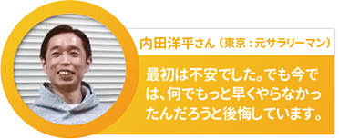 最初はやっぱり不安でしたが、始めてみると不安は吹き飛びました。周りの人たちと一緒に成長することができ、単純に嬉しかったです!サラリーマンの時では考えられなかったほど自由な生活が送れています。僕は元々田村先生と知り合う前からアマゾンビジネスをやってたんですが、出会って色々と教わったことは目からウロコの内容ばかりでした。