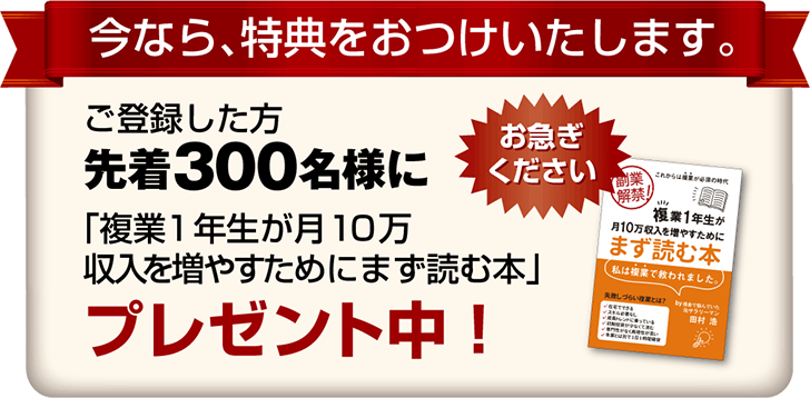 自分でビジネスやってみたい、副業やってみたい!という方で、現在何もネタがないという方には本当におススメのビジネスだと思います。ぜひ田村先生に身をゆだねてください(笑)