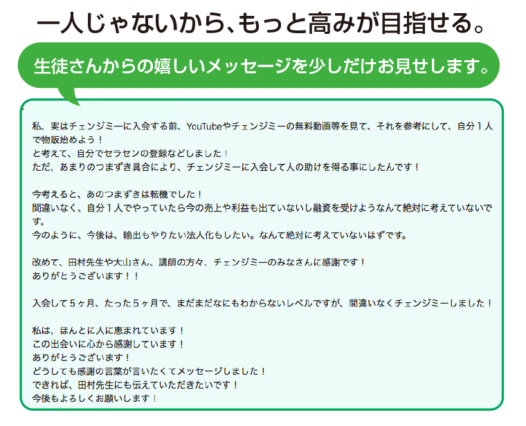 自分でビジネスやってみたい、副業やってみたい!という方で、現在何もネタがないという方には本当におススメのビジネスだと思います。ぜひ田村先生に身をゆだねてください(笑)