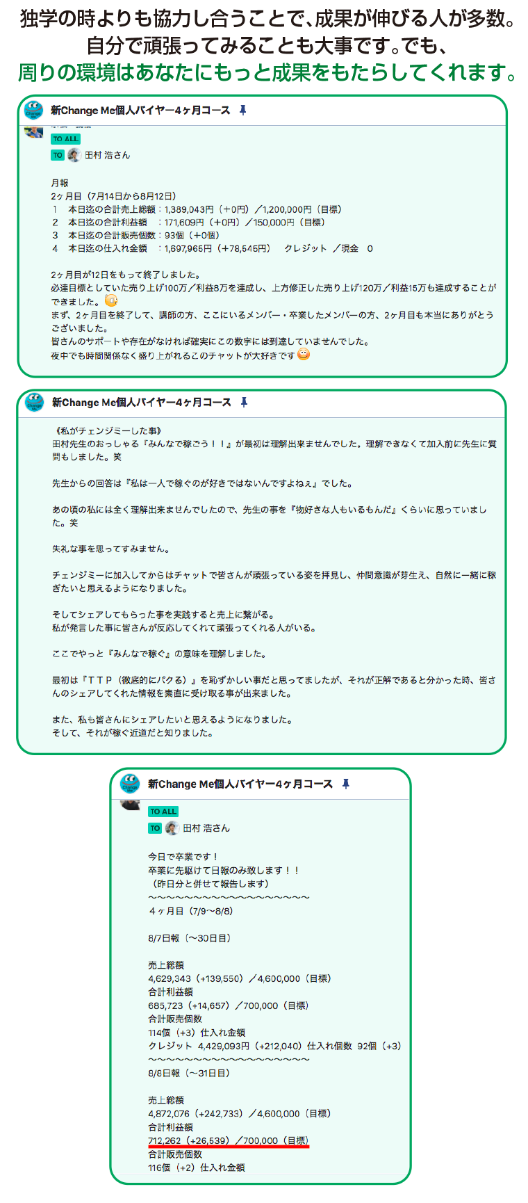 最初はやっぱり不安でしたが、始めてみると不安は吹き飛びました。周りの人たちと一緒に成長することができ、単純に嬉しかったです!サラリーマンの時では考えられなかったほど自由な生活が送れています。僕は元々田村先生と知り合う前からアマゾンビジネスをやってたんですが、出会って色々と教わったことは目からウロコの内容ばかりでした。